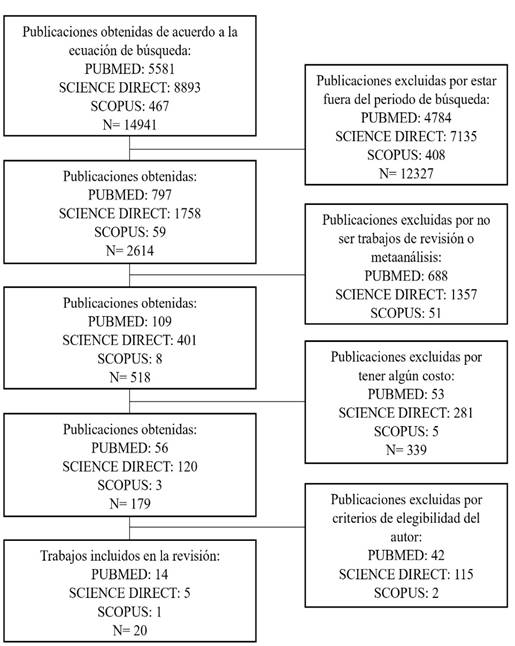 En la figura 1 se muestra el proceso de exclusión de los trabajos, iniciando por excluir aquellos que estaban fuera del periodo de búsqueda, seguido de los que no eran revisiones sistemáticas o metaanálisis, para después excluir aquellos trabajos que tenían algún costo, finalmente se excluyeron estudios de acuerdo a la elegibilidad del autor.