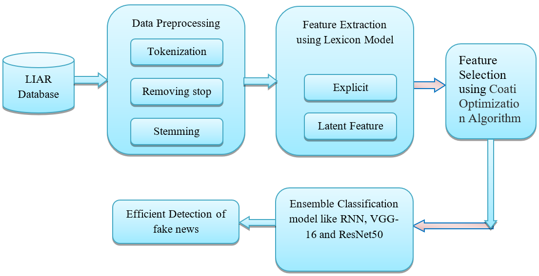 The suggested model is covered in detail in this section. The proposed model is divided into four phases: preprocessing, feature extraction based on the Lexicon Model, feature selection via the Coati Optimisation Algorithm, and ensemble learning for fake news detection based on the Recurrent Neural Network (RNN), VGG-16, and ResNet50 models. Overall architecture of the proposed model is shown in figure 1.