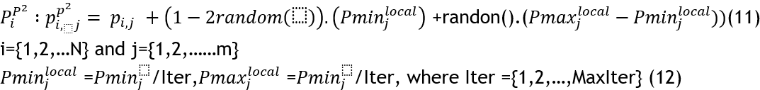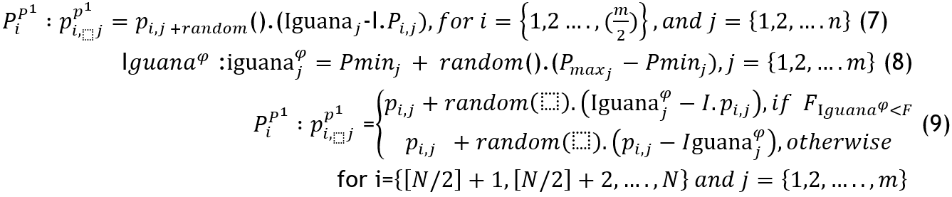Where Pi represents the placement of ith coati insearch space; pi,j refers to the jth dimension.Pmaxjand Pminj define the upper and lowerbounds of the jthdimension respectively, andrandom() generates a random real number between 0 and 1. Equation 5 shows a populationmatrix of the coatis.