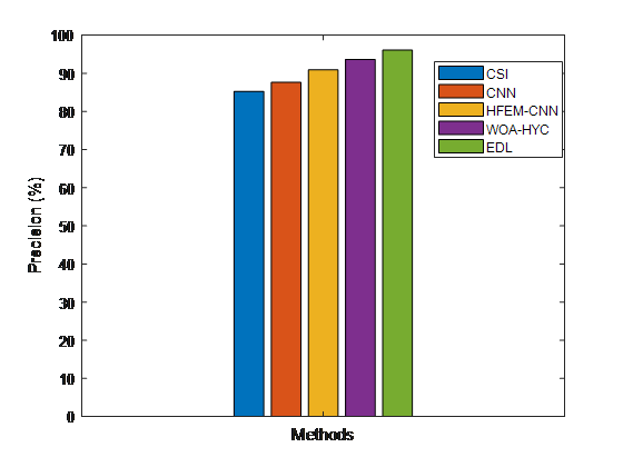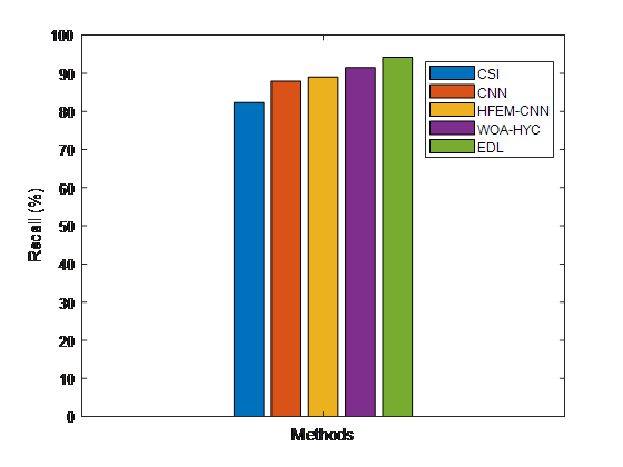 Figure 7 displays the recall comparisons between suggested and existing fake news detection methods. The suggested EDL technique performs better on the recovery side than the already employed classification algorithms, according to the results.