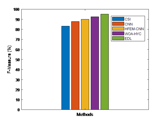 Figure 8 displays a comparison of proposed and current F-metric fake news detecting methods. The suggested EDL approach outperforms the analytical methods, according to the results. The F-metric was used to determine the groupings.