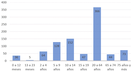 Los beneficiarios están distribuidos en los grupos etarios (Gráfico No. 2), siendo así que se atendieron 36 (4 %) entre los 0 a 12 meses, 5(1 %) de 13 a 23 meses, 64 (7 %) de 2 a 4 años. 128 (14 %) de 5 a 9 años, 152 (17 %) de 10 a 14 años, 47 (5 %) de 15 a 19 años, 36 (40 %) de 20 a 64 años, 44 (5 %) de 65 a 74 años y 73(8 %) de 75 años en adelante.