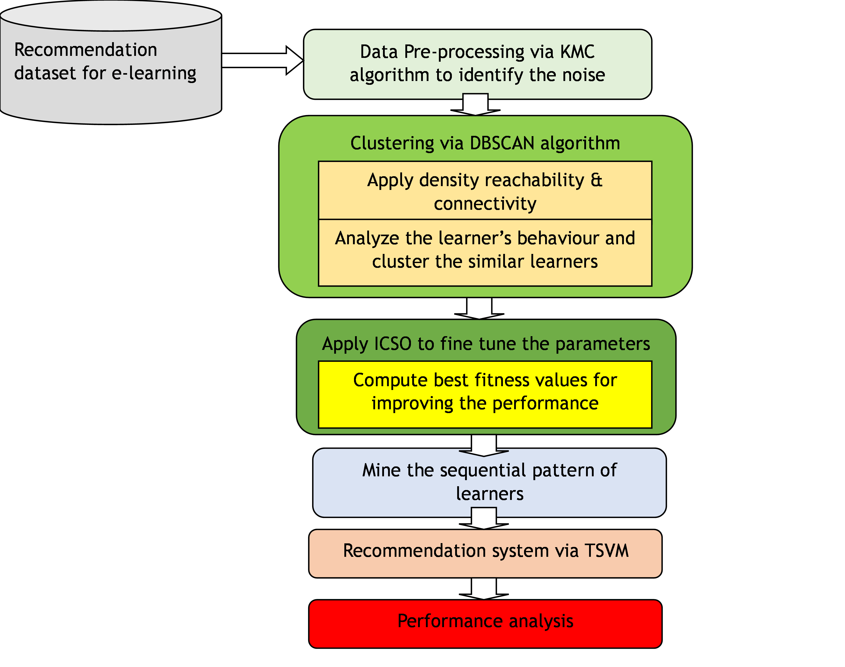 Here, ICSO-TSVMtechnique is suggested to enhance the recommendation systemfor e-learning more effectively. It contains main steps are such as pre-processing, clustering, optimization and e- learning recommendation. Figure 2 displays the suggested method’s general block diagram.