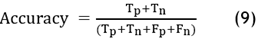The total actual classification parameters Tp+Tn is determined by calculating the model’s accuracy and dividing it by the total of the categorization variables (Tp+Tn+Fp+Fn). The accuracy is determined as follows:
