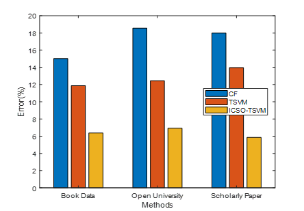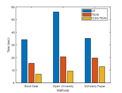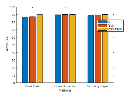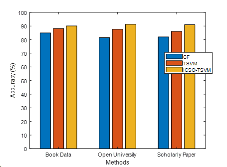 The efficiency of the suggested ICSO-TSVMsystemis evaluated and compared with previous approaches such asCF and TSVM algorithms. Utilizing Matlab, the tests are executed out. The accuracy, recall, precision, decreased MAE, and temporal complexity of the present and suggested approaches are evaluated.