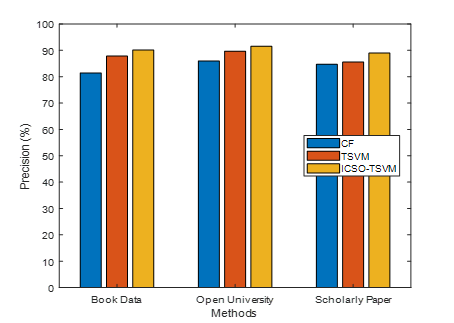 As seen in figure 7, Utilizing currently available methods, the precision of the opposing metric is evaluated. Methods form the x-axis while precision values are plotted on the y-axis. The proposed ICSO-TSVM algorithm provides higher precision whereas existing CF and TSVM methods provide lower precision. The learners’ grade may clarify according to the gain from the excellent answer, and from there, relying on the repeated rating cycle, the clustered customers may be divided. Thus, the result concludes that the suggestedICSO-TSVM approach improves the informative features accurately for recommendation process.