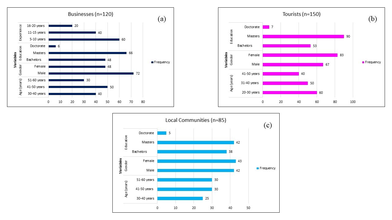 The demographic characteristics of the respondents in this study provide valuable insights into the diverse perspectives and experiences within Kerala’s tourism industry. The sample, comprising 355 individuals, encompassed three key groups: businesses (n=120), tourists (n=150), and local community members (n=85), as depicted in table 1and represent the figure 2.
