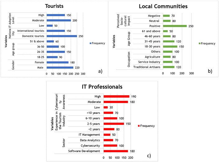 The study encompasses three primary groups: tourists visiting Kerala, local communities engaged in tourism-related activities, and IT professionals involved in the tourism industry. The sample size for each group is approximately 400 individuals, ensuring a diverse and representative dataset. The demographic statistics include frequency and percentage distributions for key variables within each group. The demographic statistics, presented in table 1, highlighted key variables such as gender, age group, nationality, IT adoption level, occupation, and perceived socio-cultural impact.