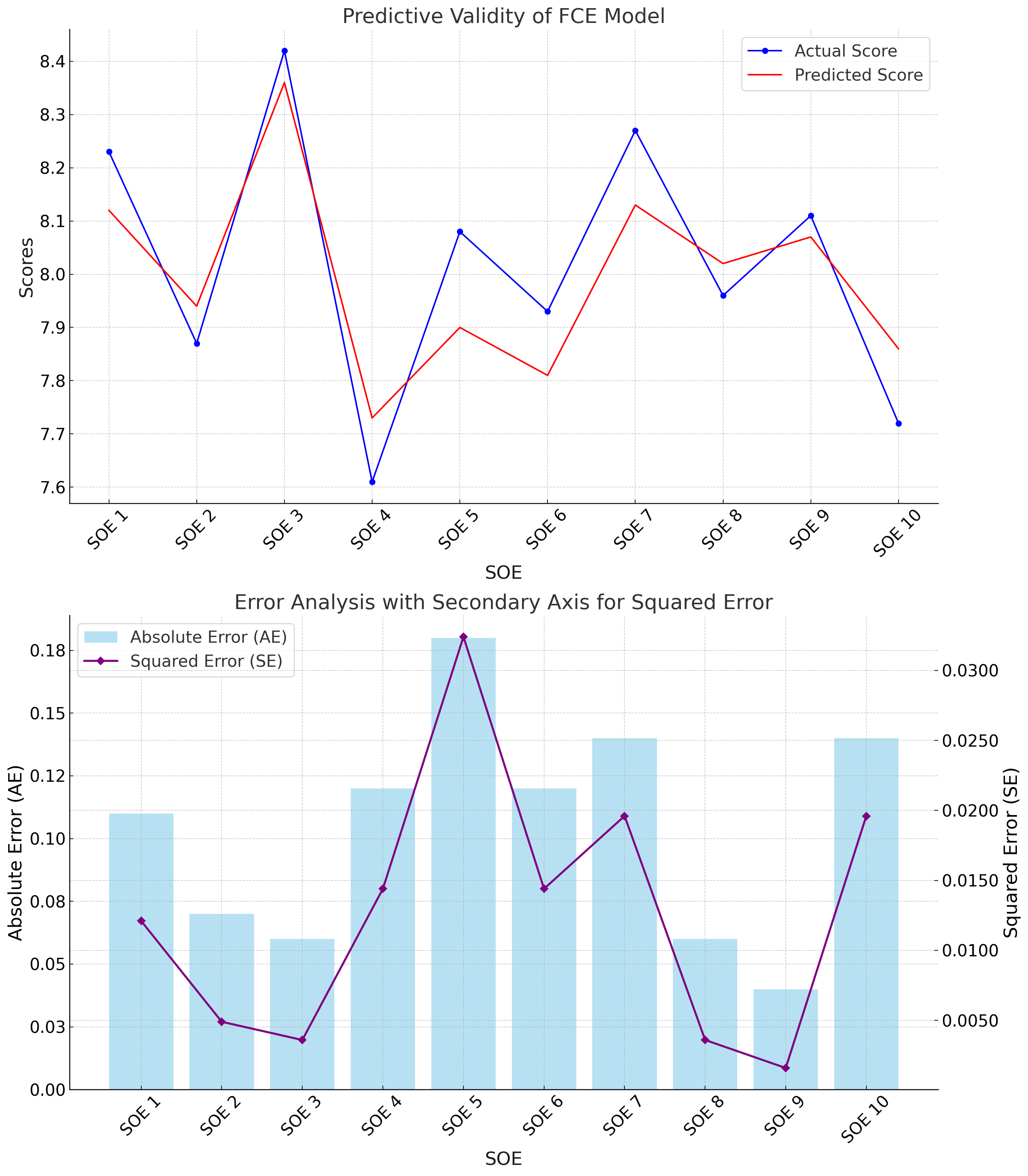 The predictive validity analysis shows that the absolute errors range between 0,04 and 0,18. SOE 5 and 10 show the highest absolute errors of 0,18 and 0,14, respectively. On the other hand, the most minor absolute error is observed for SOE 9, with a value of 0,04, which displays a close alignment between the predicted and actual scores. The squared errors also display the model’s better predictive performance. The SOEs 5 and 10 have the highest squared errors (0,0324 and 0,0196), which indicate the need for refinement. The model also shows lower squared errors for SOE 3, 8, and 9 (ranging from 0,0016 to 0,0036) that reflect accurate predictions.