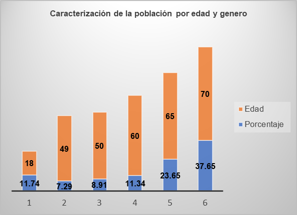 La figura 1 describe la frecuencia de edad y sexo de la población en estudio. Según estos datos el 43,72 % (n=108) pertenece al género femenino, mientras que el 56,28 % (n=139) son del género masculino, siendo este último el más prevalente.