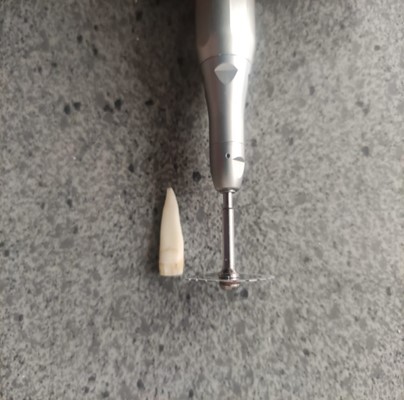 Los pines interdentinarios atornillados fueron colocados en los cuatro ángulos de la línea del diente a 1 mm de sus uniones dentina-esmalte y paralelos al eje del diente. Esto se logró utilizando una broca helicoidal autolimitante de 2 mm, colocándolos manualmente y reconstruyéndolos con resina híbrida para obtener la altura de muñón deseada.