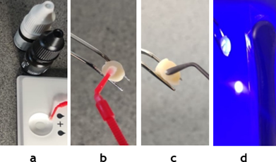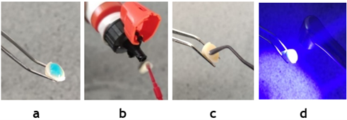 Figura 13. Protocolo de adhesión. a) 1 gota frasco A frasco B b) Aplicación de adhesivo c) Incremento de 2,5 mm de resina d) Fotopolimerización 20seg