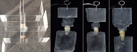 Las piezas dentales reconstruidas fueron colocadas en troqueles de acrílico transparente con dimensiones de 10 cm de longitud y 2,5 cm de ancho, con un gancho en la parte superior para ser llevadas a la máquina de ensayo.