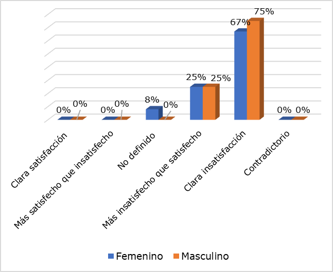 El índice de Satisfacción general en el grupo femenino, fue de -0,792 y en el grupo masculino de -0,875. En el caso del sexo femenino, este valor indica un alto nivel de insatisfacción entre las mujeres respecto a las barreras arquitectónicas en las instituciones de justicia. Aunque es negativo, es ligeramente mayor que el del grupo masculino, lo que sugiere que las mujeres, aunque muy insatisfechas, están marginalmente menos insatisfechas que los hombres. En el grupo masculino, este valor también muestra un alto nivel de insatisfacción entre los hombres respecto a las barreras arquitectónicas en las instituciones de justicia. Este índice es más negativo que el del grupo femenino, indicando que los hombres están aún más insatisfechos que las mujeres.