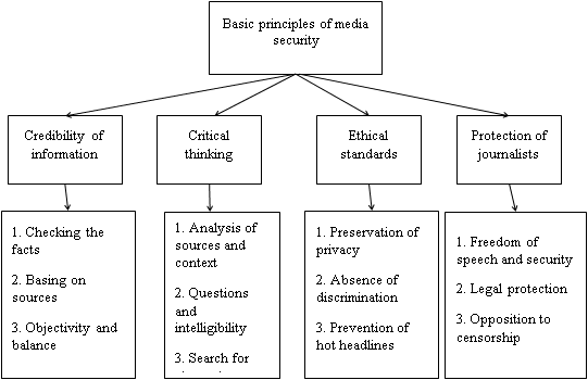 Ukraine is in a struggle for freedom and democracy, and this struggle is important not only for the Ukrainian people, but also for the international community. Today, Ukraine has become an arena where Russian aggression and a society striving to protect its independence and values are facing each other. Ukrainian youth show great enthusiasm and activity in highlighting the situation in the country and fighting propaganda.(39,40,41) In this regard, there is a need for media literacy among young people, which will help to recognize misinformation and maintain critical thinking. Based on the studied research material, the main principles for ensuring media security were formed (figure 1).