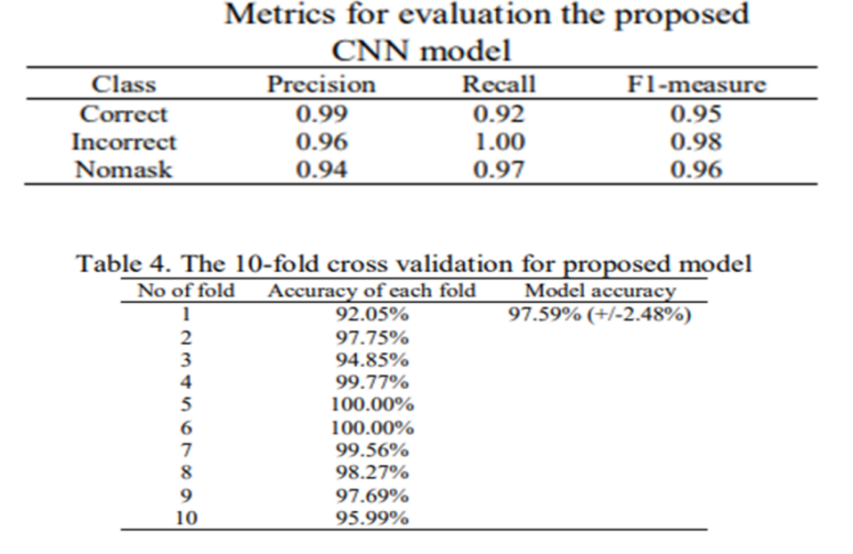 Classification through deep neural networks is regarded as the most accurate method. They can perform better than other techniques in terms of both loss functions and accuracy. Ashwan et al.(30) in his paper, he experimented with deep learning neural networks to verify whether to wear a mask. Recorded the precission, the specific data is shown below figure 1.