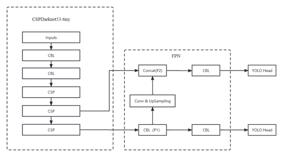 The YOLO V4-TINY is a lightweight variant of the YOLO v4. It offers a faster response while reducing accuracy. The feature extraction network is CSPDarknet53-tiny, which consists of two CBLS (Conv2D-BN-Leaky-ReLU) and three CSPblocks. CSPBlock doubles the number of gradient paths by splitting and merging strategies across phases, to reducing the computational cost of the model. First, FPN has two inputs, Feat1 and Feat2. Feat1 is Conv convolved to produce an output P1, and then convolved and upsampled to produce a second output P2. The two outputs are convolved a little to produce two YOLO Head prediction feature layers.