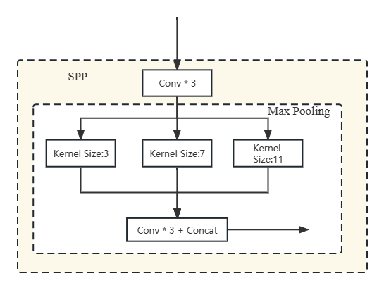 Inspired by SPP, this paper optimizes SPP accordingly, and the improved SPP is shown in the figure figure 3. In this case, three pooling layers, each with a step size of 5 × 5, 9 × 9 and 13 × 13, were used to maximize their input features. The three local features of the different scales were also obtained. The network’s detection accuracy is enhanced by stacking the various local features with the global input features. A richer feature table is also created to help improve the network’s performance.