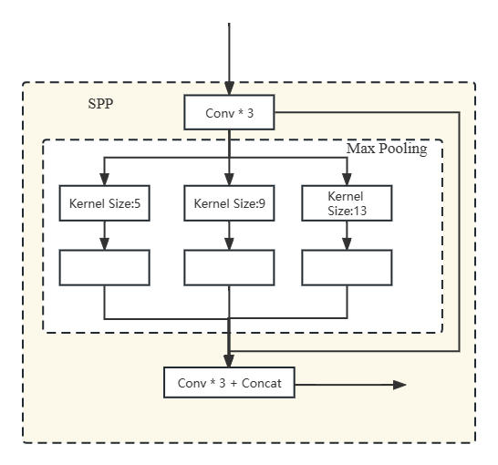 Due to the complexity of the classification process, it is usually recommended to use clipping or distortion after the convolution layer has been processed. However, in this way, it is easy for the algorithm to lose important information. Therefore, the Spatial Pyramid Pooling (SPP) module is introduced in this paper, which can pool and fuse the feature layers extracted at multiple scales and obtain the output of fixed size. The specific structure is shown in the figure.