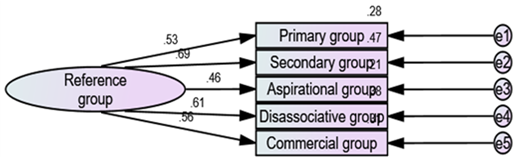 In the first stage of analysis the researcher intended to operate confirmatory factor analysis to confirm the factors of reference groups followed by the factors of brand connectivity. After entering the data particularly for the factors of reference groups and brand connectivity the researcher computed total average scores for each and every factor of reference groups and brand connectivity to apply confirmatory factor analysis. The main reason for applying confirmatory factor analysis is to confirm the factors of reference groups namely primary reference group, secondary reference group, aspirational reference group, dissociative reference group and commercial reference group, similarly the brand connectivity factors must also become found namely brand advertisement, brand characteristics, brand recall, brand experience and brand satisfaction. The confirmatory factor analysis can be achieved through the testing of three hypotheses proposed by the researcher to the six-fit indices obtained for reference groups and the brand connectivity respectively. The six-fit indices chi-square value, P value, comparative index, normal fit index, goodness of fit index and root mean square error of approximation must satisfy their benchmark values independently for reference groups and the brand connectivity factors. The results of the confirmatory factor analysis for reference groups is given below.
