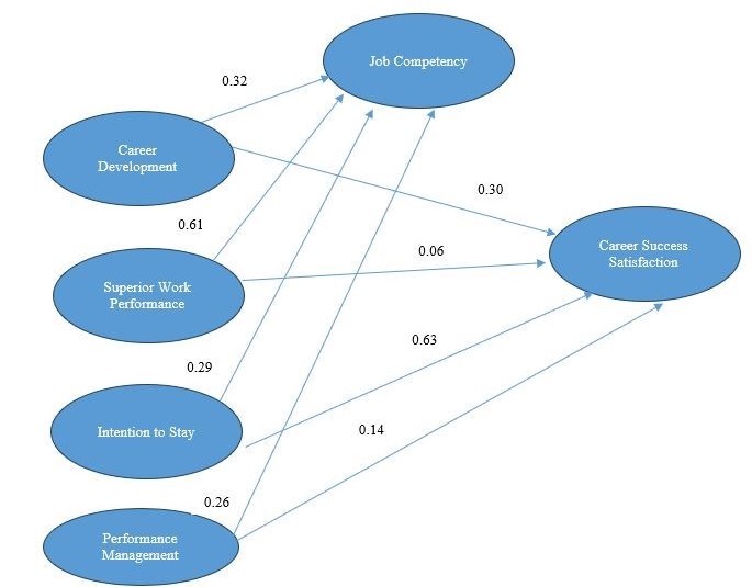 Job competency not only has a direct effect on one’s satisfaction with their career success but it can also serve as a mediator between effective career management and being content with one’s professional achievements. According to,(14,52) a mediator serves as the pathway through which an independent variable influences the dependent variable of interest. Two distinct mediation processes are: complete mediation and partial mediation. In the context of statistical analysis, complete mediation occurs when the relationship between the independent and dependent variables loses its significance upon inclusion of a mediator variable. Conversely, partial mediation occurs when there is a reduction in the strength of the direct effect, but it remains statistically significant even after incorporating the mediator variable.