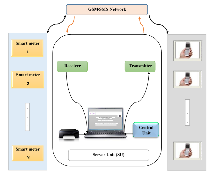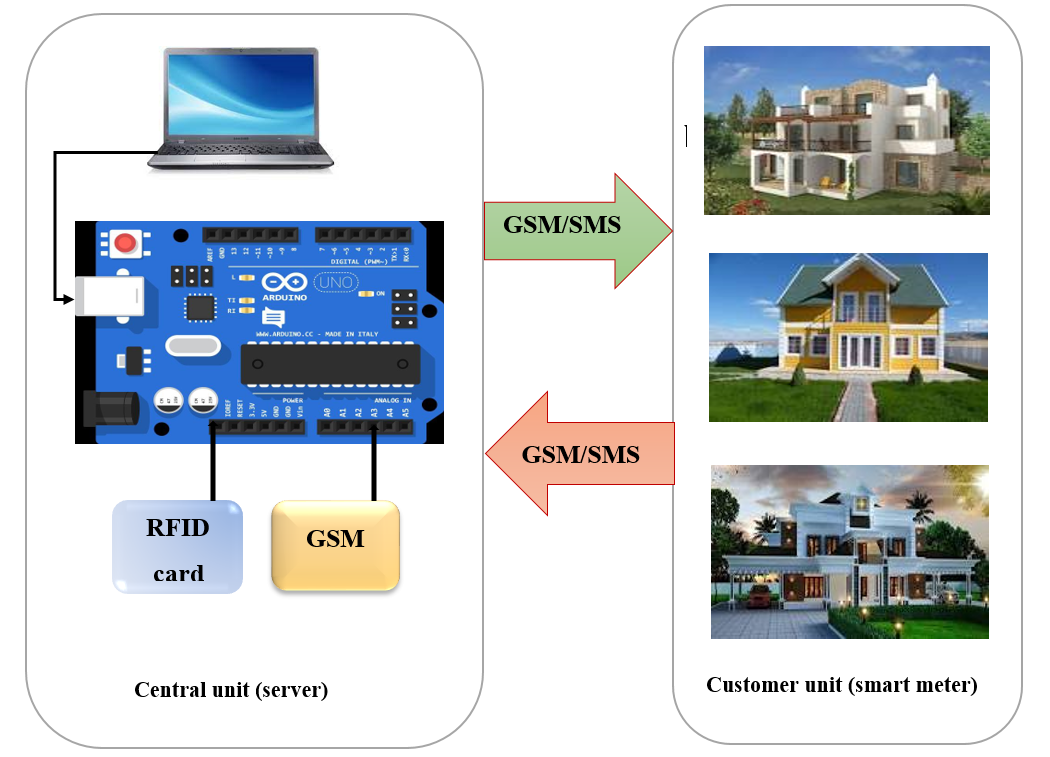 The two GSM devices located in each of the smart meter and the control center are each equipped with a mobile SIM card programmed with the customer’s mobile SIM card to exchange SMS.