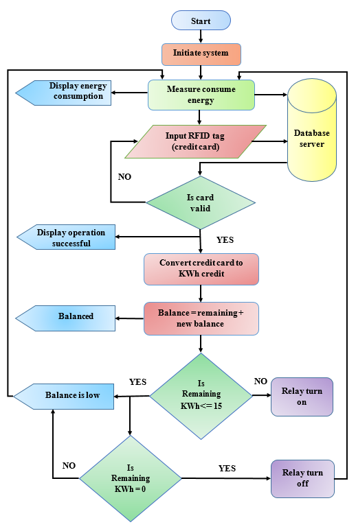 When the remaining KWh reaches a low level, for example, (KWh≤15)of the balance, the server will wirelessly send an SMS via GSM to the customer’s personal mobile phone to inform them about the meter recharge. If the energy balance reaches zero, the microcontroller sends a signal to the relay to stop the load. In this case, the consumer must recharge the energy balance to re-close the relay circuit again to operate the consumer load. Also, an alarm bell will be issued in the consumer meter when the energy balance drops to the mentioned value. Figure 2 illustrates the flowchart of the system algorithm.