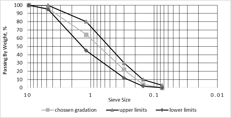 In this research, fine aggregates, which have passed through sieve No. 4, were employed from the Al-Ukhaider region. A sieving shaker was utilized to classify the fine aggregates into different size fractions, facilitating the selection of the optimal gradation. The chosen gradation is presented figuratively in figure 1.