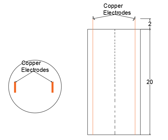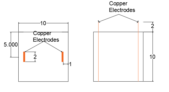 The electrode placement in the fabricated specimens followed a parallel orientation concerning the load direction, as indicated by Al-Dahawi et al.(12) the insertion of these electrodes was carried out at the midsection of the pouring face of each specimen. For a visual presentation, refer figure 3 (a, b, c), which depicts the precise location of the two embedded electrodes in all types of specimens produced.