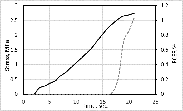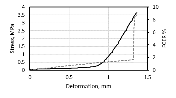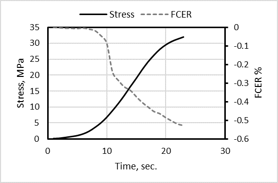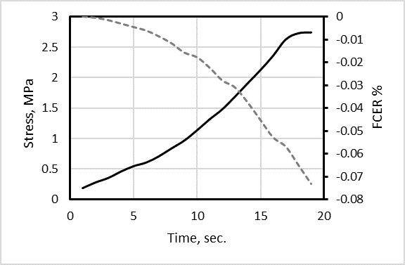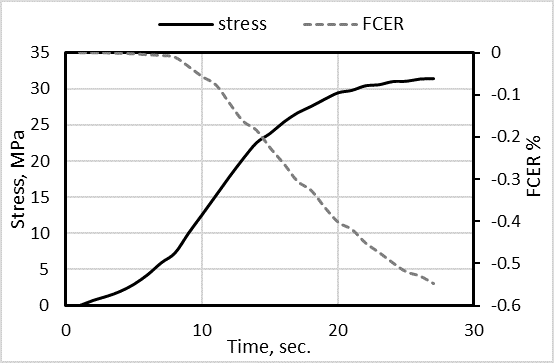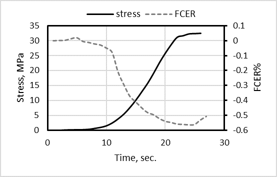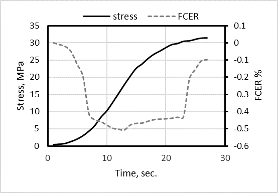 Figure 6 a, b displays the outcomes derived from the electromechanical examination of the concrete cylinder in figure 6 a. It was observed that in instances where the load was applied parallel to the electrodes, there was a corresponding decrease in FCER %, as the stress increased over time, measured in seconds. The observed augmentation in conductivity can be attributed to the growing cohesion among concrete particles with the escalating load as shown in figure 6 a.