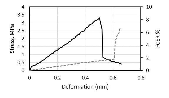 The flexural test has been of significant importance in assessing concrete’s capacity to bend and withstand vibrations. This test was conducted by applying a four-point load as prescribed by ASTM C78.(30) The concrete specimen has been positioned utilizing the WDW200 E apparatus, which boasts a 200 kN load capacity and operates at a velocity of 1 mm per minute. Simultaneously, the electrical conductivity and the electrical resistance of the concrete have been examined and expressed as a percentage (FCER %). Both the stress, measured in megapascals (MPa), and the resistivity have been assessed concerning the deformation in millimeters. Figure 8 has been utilized to depict the findings related to self-sensing within the context of four-point flexural strength. These figures allow for the assessment of self-sensing plots in three distinct segments by examining their variations in comparison to flexural stress-deformation plots. The first segment encompasses the range in which the flexural stress-deformation plot maintains linearity, commencing from the initiation of flexural loading and concluding with the emergence of the initial fracture (the elastic phase). The second phase commences with the onset of the first cracking and proceeds with a deflection hardening process characterized by the occurrence of numerous microcracks. The third segment represents the deflection-softening region, where a significant reduction in the load-bearing capacity under flexural stress is observed due to the localization of a specific microcrack, ultimately failing.(31,32) The flexural analysis has revealed intriguing findings. As shown in figure 8 As stress levels have intensified, the electric resistivity of FCER has shown a noticeable rise. However, upon reaching the critical failure point and the subsequent occurrence of fracture, an even more significant increase in resistivity has been observed. This phenomenon can be attributed to the divergence among concrete particles, resulting in reduced conductivity. The study has highlighted a correlation between stress-induced changes and the electrical properties of the material, shedding light on the intricate behavior of concrete under varying stress conditions.