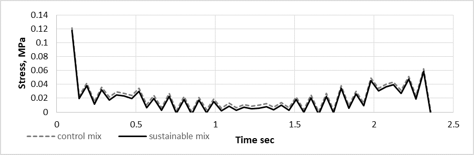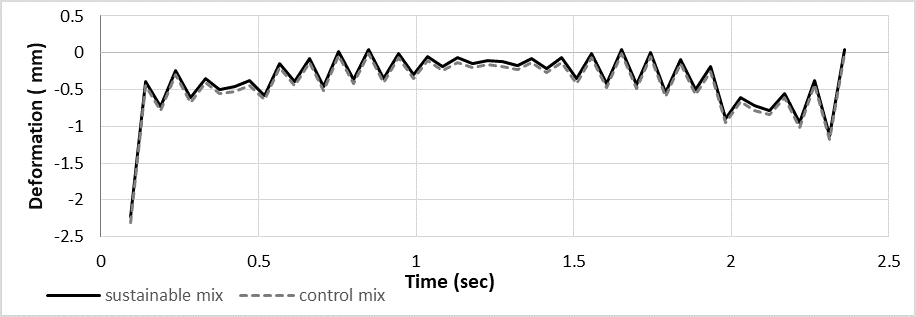 The mixture containing sustainable materials, including silica fume and fly ash, exhibited a noticeable improvement in terms of resistance to deformation and shear stress when compared to the plain mix. This finding suggests that the incorporation of these sustainable materials has a positive impact on the mechanical behavior of the structure under a moving load, hinting at its potential to enhance the overall performance and durability of the material composition and one of the reasons for this improvement that silica fume has the potential to make a substantial contribution to the improvement of concrete’s mechanical properties. The combination of silica particulates with water, in conjunction with the presence of calcium hydroxide resulting from cement hydration, triggers a pozzolanic reaction. This reaction, in turn, leads to the generation of a greater quantity of calcium silicate hydrate (C-S-H) gel.