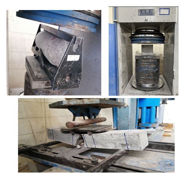 Testing was performed in accordance with ASTM C39-05,(10) ASTM C496-05,(11) and ASTM C78-15a,(12) respectively, for tests of compression, splitting strength, and modulus of rupture (Figure 5). BS (1881): Part 203(13) is also followed while doing ultrasonic tests. Calculating the velocity is as follows: