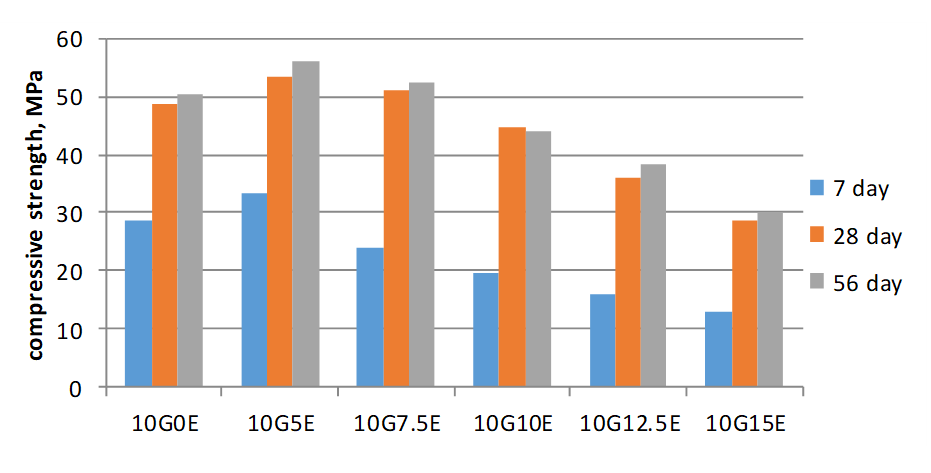 All specimens were experimentally cured for 7, 28, and 56 days. The compressive strength of control and concrete mixtures with various weight percentages of E and 10 %G is shown in figure 6. According to the findings, concrete mixtures improved their compressive strength by up to 10G7,5E. Additionally, by extending the curing age at the appropriate weight percentages of E, the compressive strength increased. Additionally, at all testing ages, the compressive strength values for 10G5E were greater than the reference specimen's compressive strength by about 16,37 %, 9,63 % and 10,85 % at 7, 28, and 56 % days. Additionally, the compressive strength was lower than the control mix because of the greater weight percentages of E.