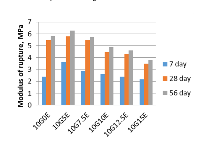 All of the specimens were experimentally tested for modulus of rupture at 7, 28, and 56 days after curing (Figure 8). The findings showed that for any given weight percentage of E, the modulus of rupture rose as the curing age increased. Additionally, the addition of glass and eggshell as powder led to a progressive decline in the specimens' content greater than 5 % eggshell. The E content, which is regarded as lime, is obviously correlated with the concrete strength. It was discovered that all mixture strengths were lower than controls and fell off when natural lime concentration rose at the same age. According to findings, concrete's ability to acquire strength is substantially impacted by the quality of the E.(14)