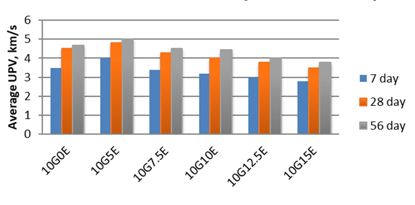 · The mix 10G5E gave the highest UPV by about 14,28 %, 6,66 %, and 6,8 % at 7, 28, and 56 days, respectively compared to the control specimen.