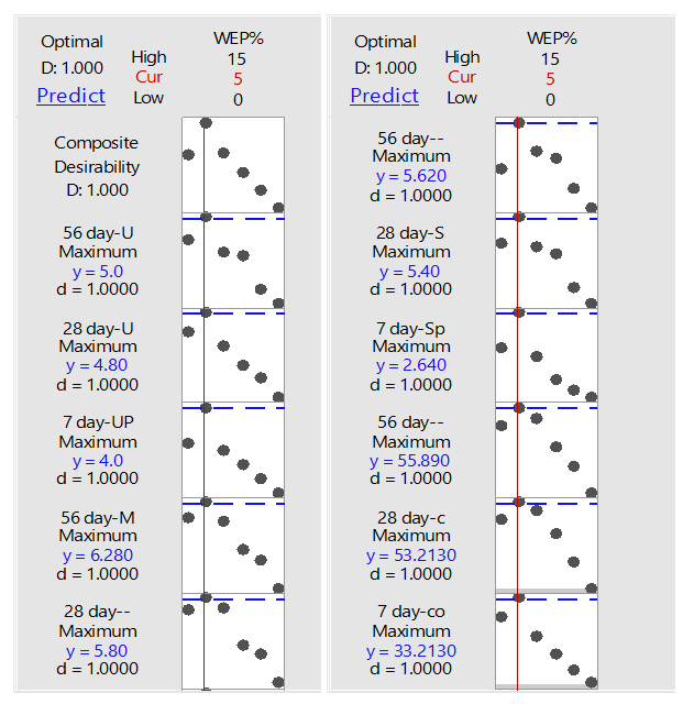 The simulation of the optimization response also made use of the desirability function technique. Properties that were assessed in this investigation at various ages served as the main variables in the analysis. In the optimization study, these variables were regarded as dependent factors, whereas E content was regarded as an independent factor. According to the study process (Figure 11 and table 1), 5 % is the optimal E content to be utilized with 10 % glass for the best possible performance.