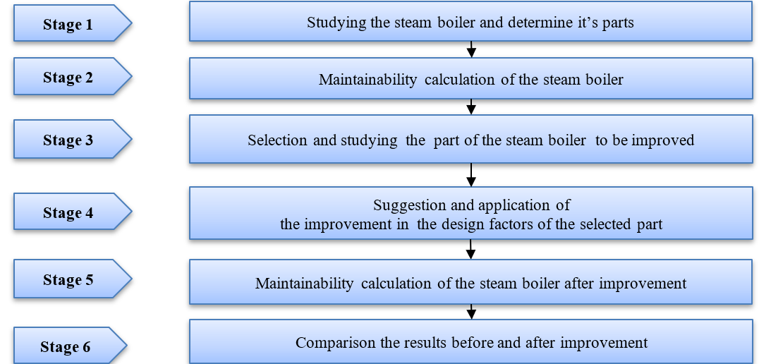 The concept of maintainability pertains to the capacity of a system to undergo repair and be restored to operational status through the efforts of employees possessing specialized skill sets, according to prescribed procedures, and employing designated resources.(14) The primary goal of maintainability engineering is to provide a system or product that is designed in a manner that facilitates ease of maintenance, ensuring its ongoing and cost-effective utilization, as well as maximizing client accessibility. Establishing maintainability design objectives is crucial at the early stages of product development.(3) The purpose of this research, which studying the steam boiler and improvement of the design factors to increase its maintainability is achieved through a five-stage, as seen in figure 1. The present study utilized the South Baghdad Thermal Power Station Steam boiler as the chosen case study.