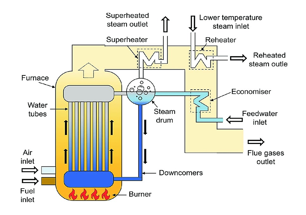 The boiler is a crucial component of the station. A steam boiler may be described as a container characterized by a restricted heating surface area and a finite water capacity. The use of thermal energy elevates the temperature of the water to its boiling point, resulting in the generation of a finite quantity of steam. The boiler comprises many key components observed at the work site and gathered from the available information. These fundamental parts are as follows and as shown in figure 2: Drum, Headers, Furnace, Super Heater, Economizer, Air Heater, Steam Coil, Induced Draft Fan, and Chimney. Also, the boiler consists of the necessary accessories such as Safety Valves, Soot Blower, Boiler operation control devices, and Measuring Instruments (disposal devices, pressure gauges, temperature measuring devices, gas analyzer, and automatic control devices).