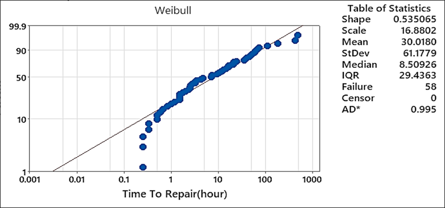 Calculate Time To Repair (TTR) as shown in table 1 and analyze the data to determine if this data is subjected to any distribution to calculate the mean time to repair, repair rate, and maintainability of the steam boiler. After calculating the time to repair, this data must be analyzed to find out which type of distribution applies to it to complete the rest of the calculations and find the maintainability of the steam boiler. The Minitab program is adopted for this purpose. The data obtained is subjected to the Weibull distribution, as shown in figure 3.