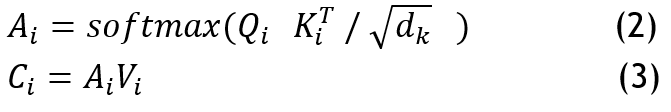 Where n is the length of the sequence, multi-head attention computes a set of attention weights (A) and a set of context vectors (C) given in equation (2) and (3).