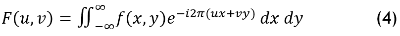 Fourier Transform is a mathematical operation that transforms a signal from its original domain (e.g., spatial domain for images) to the frequency domain. The formula for the 2D Fourier Transform of an image function f(x, y) is given by equation 4.