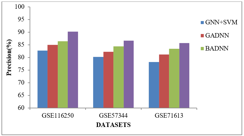 Figure 3 presents the precision comparison of classifiers like GNN+SVM, GADNN, BADNN, and proposed classifier (EPOA+DAE) with respect to gene datasets (GSE116250, GSE57344, and GSE71613). EPOA+DAE classifier has produces highest precision results of 90,21 %, 86,61 %, and 85,72 % (GSE116250, GSE57344, and GSE71613). GNN+SVM, GADNN, BADNN has lowest precision of 82,66 %, 84,95 %, and 86,44 % for GSE116250 dataset (Refer Table 6).