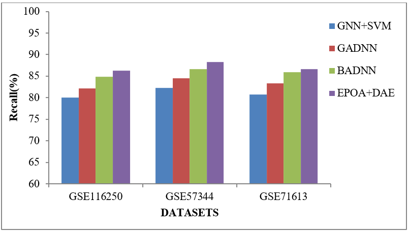 Recall comparison of classifiers like GNN+SVM, GADNN, BADNN, and proposed classifier (EPOA+DAE) with respect to gene datasets (GSE116250, GSE57344, and GSE71613) has been illustrated in figure 4. EPOA+DAE classifier has produces highest recall results of 86,29 %, 88,29 %, and 86,64 % (GSE116250, GSE57344, and GSE71613). GNN+SVM, GADNN, BADNN has lowest recall of 80,04 %, 82,19 %, and 84,82 % for GSE116250 dataset (Refer Table 6).