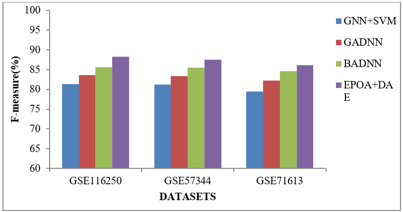 F-measure comparison of classifiers like GNN+SVM, GADNN, BADNN, and proposed classifier (EPOA+DAE) by gene datasets (GSE116250, GSE57344, and GSE71613) are illustrated in figure 5. EPOA+DAE classifier has produced highest F-measure results of 88,25 %, 87,45 %, and 86,18 % (GSE116250, GSE57344, and GSE71613). GNN+SVM, GADNN, BADNN has lowest F-measure of 81,35 %, 83,57 %, and 85,63 % for GSE116250 dataset (Refer Table 6).