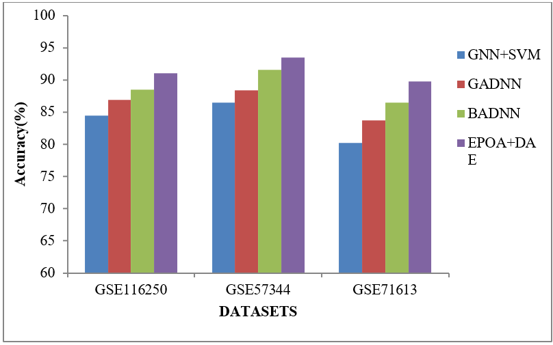 Accuracy comparison of classifiers like GNN+SVM, GADNN, BADNN, and proposed classifier (EPOA+DAE) by gene datasets (GSE116250, GSE57344, and GSE71613) has been illustrated in figure 6. EPOA+DAE classifier has produces highest accuracy results of 91,06 %, 93,44 %, and 89,72 % (GSE116250, GSE57344, and GSE71613). GNN+SVM, GADNN, BADNN has lowest accuracy of 84,47 %, 86,93 %, and 88,49 % for GSE116250 dataset (Refer Table 6).