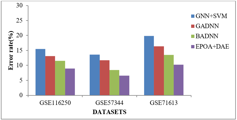 Error rate comparison of classifiers like GNN+SVM, GADNN, BADNN, and proposed classifier (EPOA+DAE) of gene datasets (GSE116250, GSE57344, and GSE71613) are illustrated in figure 7. EPOA+DAE classifier has produces lowest error rate results of 8,94 %, 6,56 %, and 10,28 % (GSE116250, GSE57344, and GSE71613). GNN+SVM, GADNN, BADNN has highest error rate of 15,53 %, 13,07 %, and 11,51 % for GSE116250 dataset (Refer Table 6).
